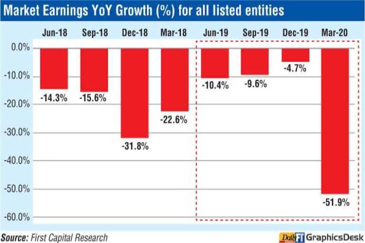 Corporate earnings of listed companies plunged by 52% year-on-year (YOY) to Rs. 33.5 billion in 2020 March quarter, First Capital Research revealed yesterday. The analysis was based on reported earnings of 266 listed companies.