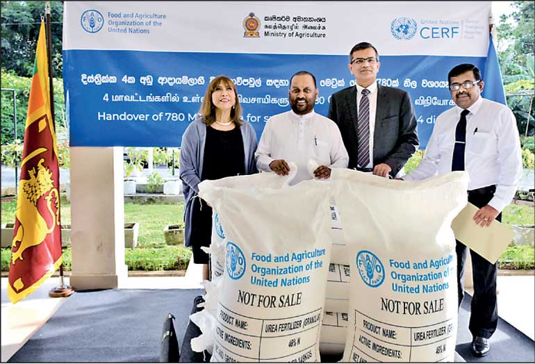 From left: UN Resident Coordinator in Sri Lanka Hanna Singer-Hamdy, Agriculture Minister Mahinda Amaraweera, FAO Representative for Sri Lanka and the Maldives Vimlendra Sharan, and Agriculture Secretary Gunadasa Samarasinghe at the handover ceremony