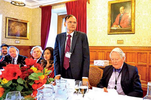Foreign Minister Prof. G.L. Peiris, who is on an official visit to the UK, yesterday addressed a gathering of members of both houses of the British parliament, and other dignitaries, in the Atlee room of the House of Lords during a luncheon hosted by Lord Michael Naseby. Here, Minister Peiris is seen delivering a speech.