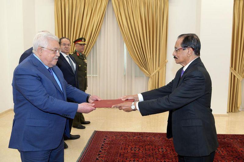 පලස්තීන රාජ්යය සඳහා ශ්රී ලංකාවේ නියෝජිත නාවලගේ බෙනට් කුරේ මහතා පලස්තීන රාජ්යයේ ජනාධිපතිවරයා වෙත අක්තපත්ර පිළිගන්වයි