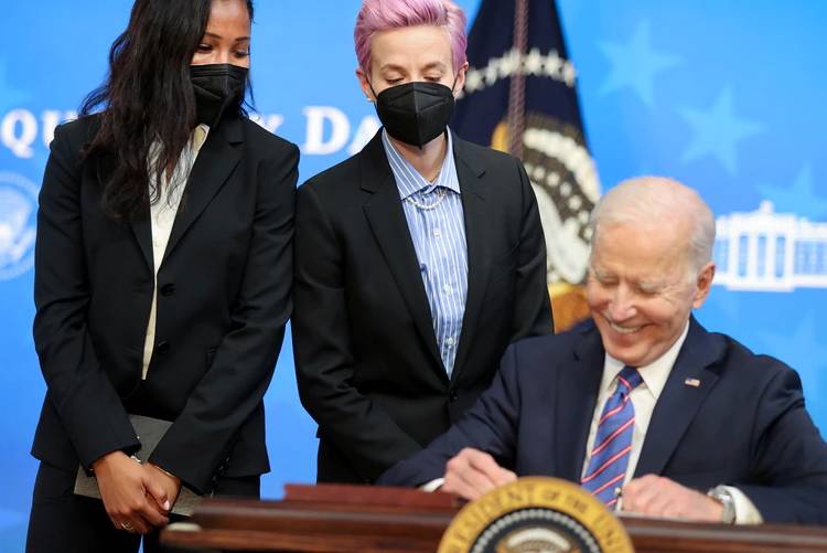 WHITE HOUSE - President Joe Biden and first lady Jill Biden highlighted the gap in pay between American men and women in an event marking Equal Pay Day on Wednesday with members of the U.S. national women's soccer team.