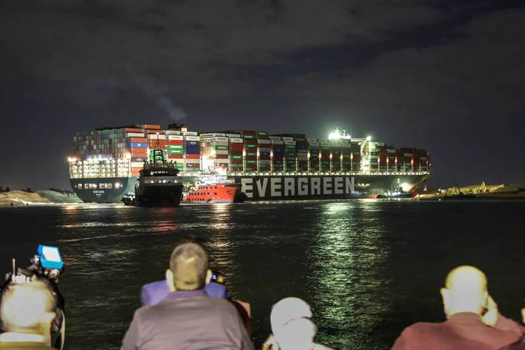 CAIRO - Egypt's Suez Canal Authority continued Saturday to try to refloat a gigantic container ship that was blocking one of the canal's main arteries, causing a massive traffic backup and seriously affecting international trade that uses the waterway.