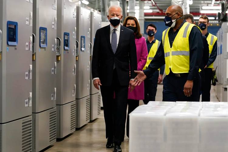 President Joe Biden toured a Pfizer COVID-19 vaccine manufacturing plant Friday afternoon outside Kalamazoo, Michigan, where he touted the safety of the vaccine.