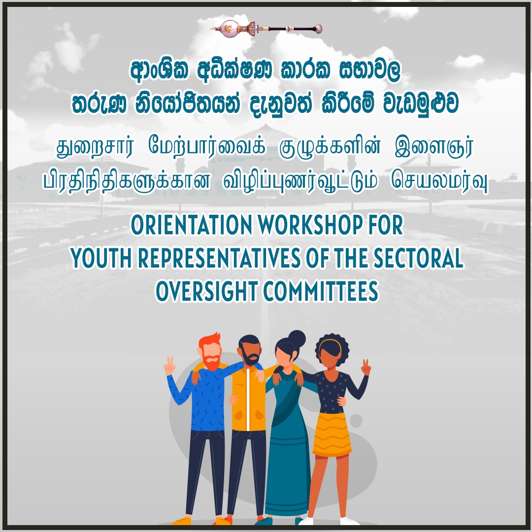 පාර්ලිමේන්තුවේ ආංශික අධීක්ෂණ කාරක සභා සමග සම්බන්ධවීමට තෝරා ගැණුනු තරුණ නියෝජිතයන් දැනුවත් කිරීමේ විශේෂ වැඩසටහනේ සමාරම්භක උත්සවය ජනාධිපති රනිල් වික්රමසිංහ මහතාගේ ප්රධානත්වයෙන් අද (13) මෙම අවස්ථාවට අග්රාමාත්ය දිනේශ් ගුණවර්ධන, කථානායක මහින්ද යාපා අබේවර්ධන යන මහත්වරු ඇතුළු මැති ඇමතිවරු පිරිසක්ද සහභාගී වීමට නියමිතය.