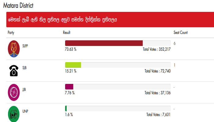 ගාල්ල දිස්ත්රික්කයේ සමස්ත නිල ජන්ද ප්රථිපලය අනුව ශ්රී ලංකා පොදුජන පෙරමුණ ආසන 07ක් දිනා ගැනීමට සමත්ව තිබෙනවා. ඒ සමස්ත ජන්ද 430,334 (70.54%) ක් ලබා ගනිමින්.